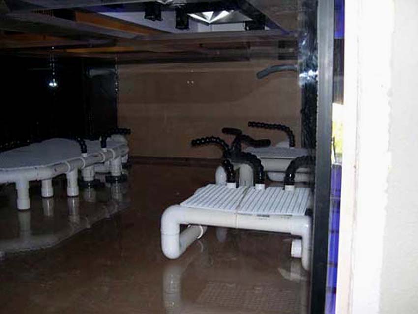 Circulation is provided primarily by a closed loop consisting of four Sequence 6000seq23 pumps, each delivering 6000gph. The closed loop system is thoroughly integrated into the rock supporting structure. The closed loop pumps are located in the stand just under the display tank. The intakes for each pump enter the display tank from the tank’s bottom and are surrounded by a cage constructed from egg crate to prevent debris and fish from being sucked into the closed loop. The outflows also enter the display tank from the tank’s bottom; but, instead of just venting into the tank, the outflows’ 1 ½” PVC pipes are formed into the shape of a platform which support the rockwork. This platform has 7 water jets coming out at various points. The jets are connected to Loc-line which can be directed anywhere in the tank and are easily re-positioned in the event that a different flow pattern is required. There are four separate PVC platforms (one for each closed loop pump) and 7 water jets per platform, yielding a total of 28 jets with approximately 900gph coming from each. Each platform has at least 3 of its 7 jets blowing under the rock supporting platform to keep this inaccessible area devoid of detritus.