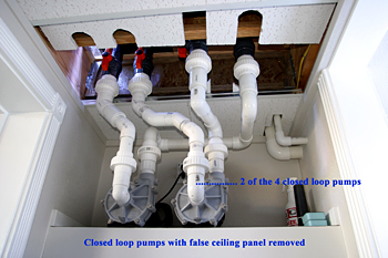The final component of circulation is the flow generated from the two return lines located at each rear corner of the tank. These return lines are powered by two Sequence 4300seq20 pumps that come from the sump .Each of these pumps is estimated to return about 2000gph to the display tank…. bringing the total circulation to approximately 28,000gph.