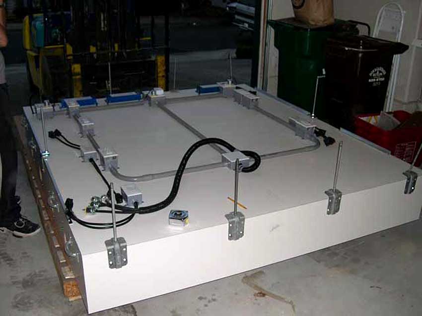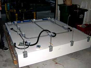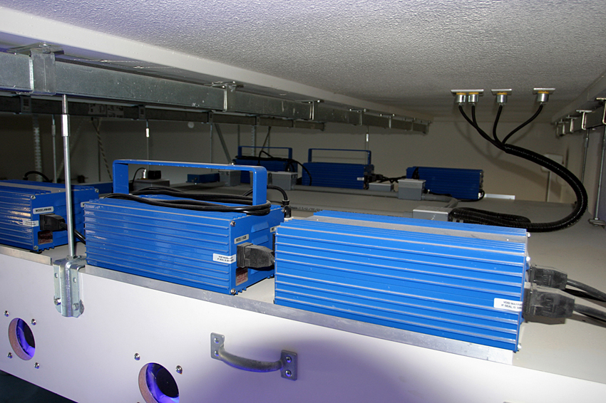 To minimize the number of electrical cords that must accommodate the sliding motion, all of the ballasts ride on top of the hood. The electrical power to the light hood is supplied by four 20 amp circuits that are located on the ceiling above the light hood. The 5800 watts of lighting consists of: