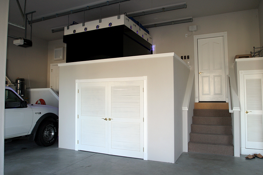 The tank’s four top openings each have a dimension of 27” X 36”. There are two 10” X 12” overflows, one in each rear corner, with black acrylic covers to reduce algae growth inside of the overflow box. Since the display tank is viewed from a den inside the house, and since the garage where the tank is located is 4 feet lower than the den, the tank sits on the stand 7 feet above the garage floor.