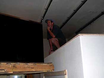 The stand is constructed from wood, drywall, and Formica. It is framed as you would frame a house. 2 X 6 framed walls, sheeted on both sides with ¾” plywood, and coupled with two large 6 X 18 laminated beams support the 2 X 12 floor joists underneath the tank.
